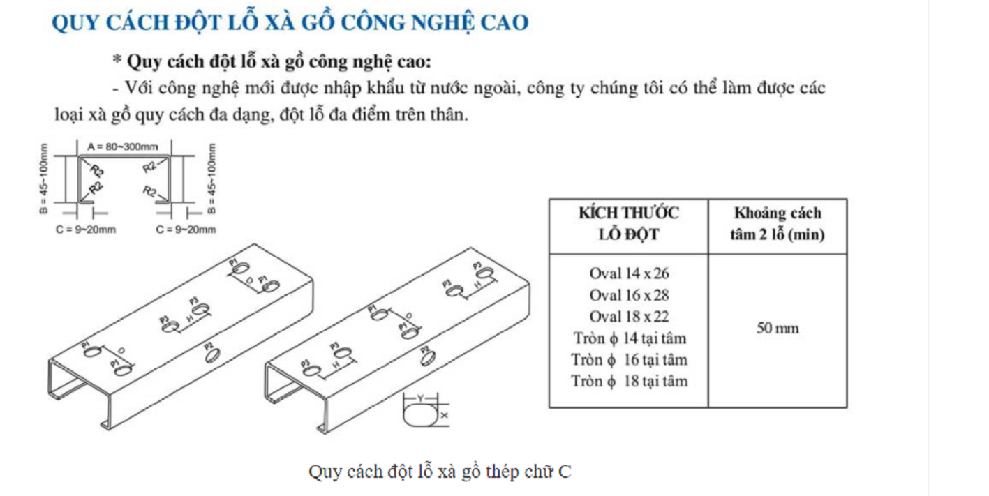 Sản phẩm xà C tại Tôn Hoa Sen Hải Phòng có đa dạng mẫu mã. Xà gồ C có size từ 80mm đến  300mm  chiều rộng đáy. Điểm vượt trội của xà gồ C là sản xuất theo độ dài bất kỳ. Thay vì quy cách sẵn độ dài 6m như hộp mạ kẽm. Ngoài ra xà gồ C Tôn Hoa Sen hải phòng còn có đột lỗ tự động. Thuận lợi cho việc lắp đặt bu lông. Thi công nhanh. Và tính cơ động cao trong việc tháo dỡ.